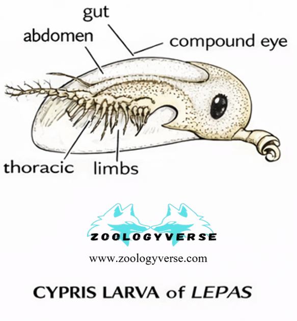 In Cirripedia (e.g. Lepas, Sacculina), the nauplius larva passes into the Cypris stage. In this form the body and appendages are enclosed within a bivalved shell provided with adductor muscle as is seen in an ostracod adult, Cypris. Its modified antennules have cement glands at their bases. All other cephalic appendages with a compound eye only, except antennae, are present. Six pairs of biramous thoracic limbs are formed. It has abdomen with 4-5 segments.