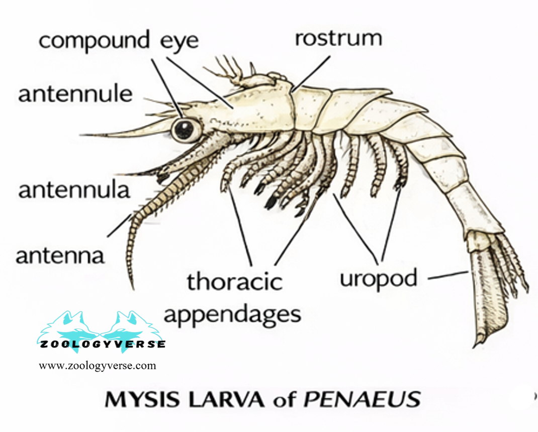 In peneid decapods (e.g. penaeus) and lobsters zoaea is modified into Mysis or Schizopod larva. It bears 13 pairs of appendages and resembles adult Mysis. It has 5 pairs of posterior biramous thoracic appendages. Abdomen is posterior similar to that of adult with 5 pairs of biramous pleopods and a pair of uropods and telson. In some lobsters mysis marks the begining of the life history as the naupleus and zoaea are passed within the egg but at the same time it marks the end of the life history of a prawn.