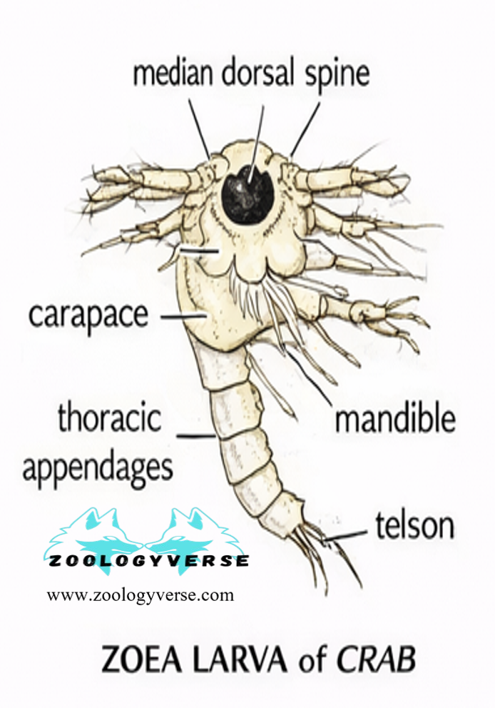 In brachyuran decapods (true crabs), zoaca metamorphoses into the megalopa larva. It resembles, to some extent, the adult crab and possesses all 13 pairs of appendages. Abdomen bears 6 pairs of pleopods and is placed straight in line with cephalothorax. In crabs nauplius stage is passed within egg which hatches as zoaea. It then by moulting forms megalopa to be metamorphosed into adult.